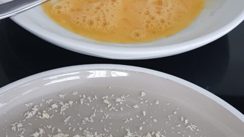 - Mehl und Panko jeweils auf einen flachen Teller geben, das Ei in einem tiefen Teller kräftig mit der Gabel verquirlen