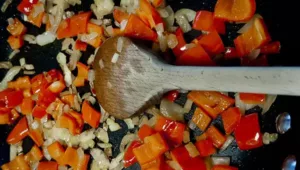 • Die Zwiebeln mit den Paprikawürfeln in einer Pfanne mit dem Öl bei mittlerer Hitze anbraten, bis die Zwiebel schön glasig und die Paprika etwas Farbe bekommen haben